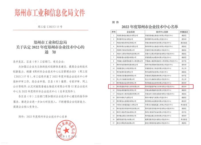 近日,鄭州市工業和信息化局公布了《鄭州市工業和信息化局關于認定2022年度鄭州市企業技術中心的通知》。經市工業和信息化局組織專家評審和綜合評估,鄭州榮盛窯爐耐火材料有限公司企業技術中心被認定為2022年度鄭州市企業技術中心。